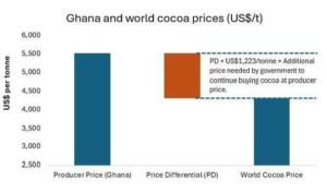 By contrast, the world market price for cocoa is around US$4,300 per tonne (or GH¢45,150 per tonne), which is significantly lower than the price paid to Ghanaian farmers. As a result, the government must spend approximately US$1,223 more per tonne to match the current producer price of US$5,523 per tonne (GH¢3,625 per bag), as illustrated in the attached diagram.